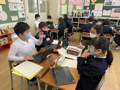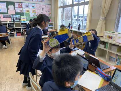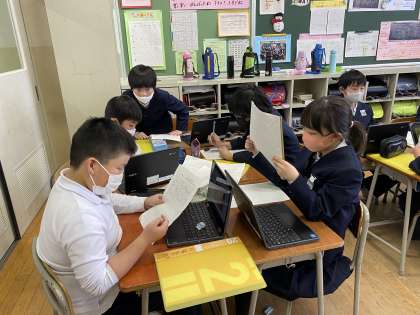 「えがこう、未来の新商品発表会」に向けて、準備を進めています。発表会のプログラムや役割分担も話し合いました。各会社の発表では、セリフについて考えを友達に伝えたり、一緒に練習したりする姿が見られました。