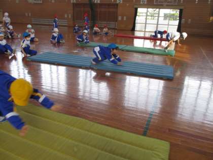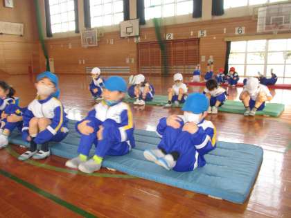 1年生は、マット運動をしています。手でしっかりと身体を支えて前に跳んだり、ゆらゆらゆりかごをしたり、仰向けになって足をピンと突き上げて身体を支えたりしています。今日は、前転にもチャレンジしました。