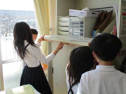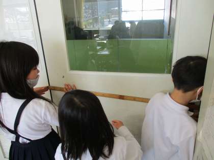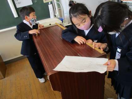 算数の「長い長さをはかってあらわそう」の学習をしています。今日は、グループで1メートルの長さのものが教室のどこにあるか予想して、1メートルの長さのものがあるかさがしました。みんなグループで協力して1メートル物差しを使い測っていました。