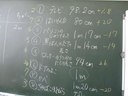 1メートルの長さを予想して、実際に物差しを使って測ったもののうち、1メートルに一番近いものを発表してもらいました。1メートルちょうどのものも教室にあり、みんな驚いていました。