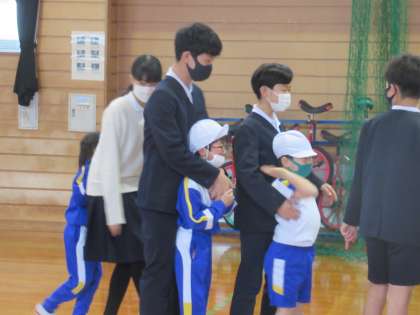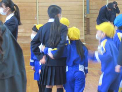 1年生と6年生が寄り添いながら楽しそうに活動しています。