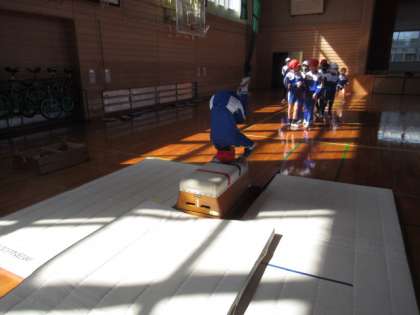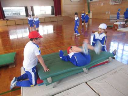跳び箱は、「台上前転」に挑戦です!ポイントをしっかり押さえて練習できました。困っている人がいたら、アドバイスをしたり手伝ったりしながら協力する姿が見られました。