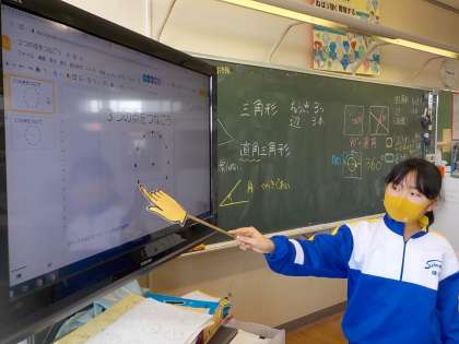 今日の算数の時間、三角形の辺の長さについて「円の中心と、円周上の2点を結んで三角形を作ると、二等辺三角形ができるのか」という課題に対して、理由を説明するという学習をしました。個別端末の画面には、テレビと同じ画面が映っています。各自にパソコンがあると、このような使い方もできるのです。