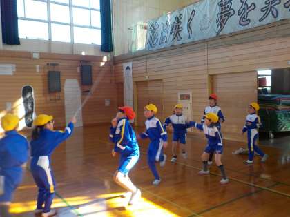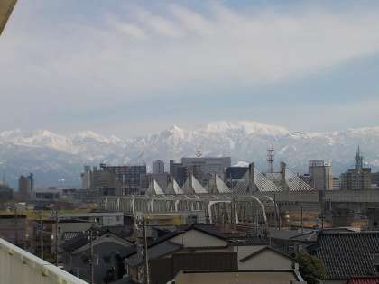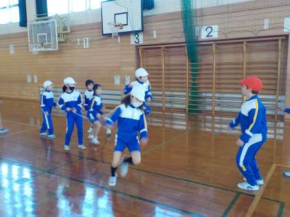 今日の体育の時間は、晴天に恵まれました。前半は、体育館で大縄で八の字跳びを練習した後、グラウンドに出て、体ほぐしの運動を行いました。立山連峰がきれいに見えていました。