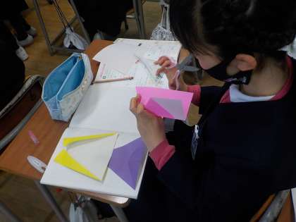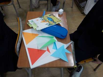 算数の時間、三角形の辺の長さの特徴や角度のひみつなど、学んだことを生かして、折り紙を使って、正三角形を作りました。「三角定規って、よく出来ているね」これが子供から聞かれた今日一番のつぶやきでした。