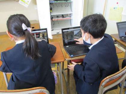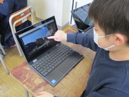 今日は、クロームブックを使ってグーグルアースを利用しました。画面に地球が出てきた瞬間に「うわあ!地球!宇宙だ−!」と喜んでいた子供たち。その地球を指でスワイプしながら、日本や富山、さらには桜谷小学校まで探すことができました。「自分の家もあるかなあ?」と探し、「あったー!これぼくんち!」「これ、班長の家!」と夢中になって見付けていました。