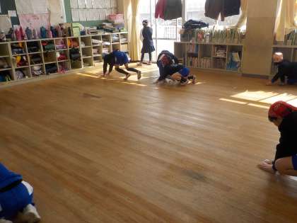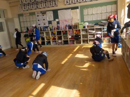 清掃の時間から5時間目にかけて、教室や廊下、階段の床を磨きました。ぬれぶきで取れないよごれはメラミンスポンジでこすり、1年間の感謝をこめて、丁寧に清掃しました。