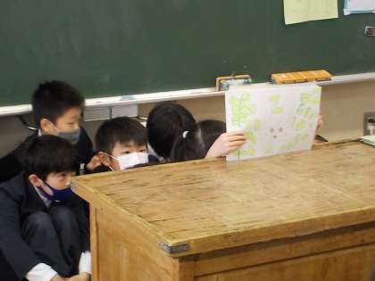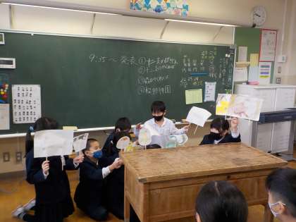 今日の外国語活動の時間は、各グループでこれまで学習してきた英語劇の発表会でした。4つの班のうち、3つの班が発表しました。台詞の言い方も各グループで練習しました。表現方法としては、ペープサートあり、紙芝居ありと、3年1組らしい楽しい時間になりました。英語の発音がよく、大きな声で発表できたこともすばらしいと思いました。