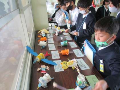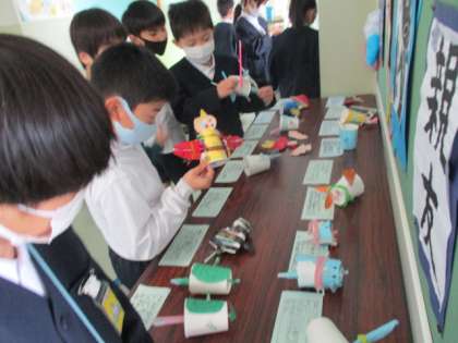 友達の「ストローでこんにちは」の作品を見ながら、ストローの動きを楽しんだり、飾り付けをよく見て友だちの良いところを見つけて発表していました。