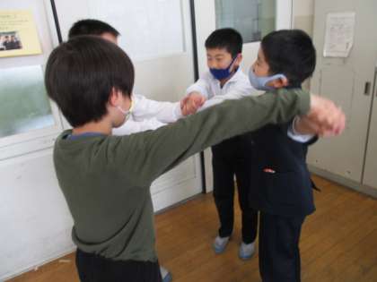 音楽の日本の昔の遊びの中で、「なべなべそこぬけ」をして遊びました。2〜6組で手をつなぎ音楽に合わせて踊り遊びました。みんなとても楽しく踊っていました。