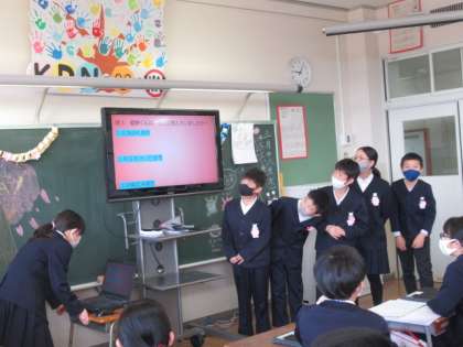 今日は、4年生最後の学級集会をしました。目当ては「みんなで協力して気持ちよく楽しむ」です。どの友達も楽しめるような、アイディア溢れるすてきな集会になりました。今回の集会のプログラムはすべてChrome bookを使ったゲームや出し物です!どの係も工夫を凝らしていて感動しました!