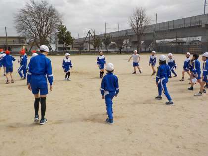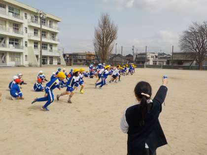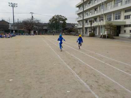 体育の時間は、4年生と合同で行いました。外で運動するのが気持ちのよい天気でした。一緒に準備運動を行ったあと、鉄棒までの競走や、スタートの合図とともに回れ右をして走り出す練習をしました。その後、50m走の記録測定をしました。冬の間に縄跳び等で体力作りをした成果は出ていたでしょうか。