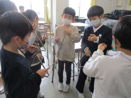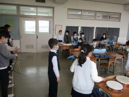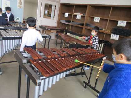 今日は「こいぬのマーチ」をみんなで合奏しました。鍵盤ハーモニカ、タンブリン、カスタネット、すず、鉄琴、トライアングルとたくさんの楽器を使いました。練習したあと、みんなで「心を一つに」を合い言葉に合奏しました。1回目は音がばらばらでしたが、2回目はみんなの心が一つになったようで、音がぴったりとそろい、素敵な合奏となりました。