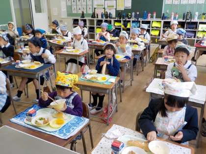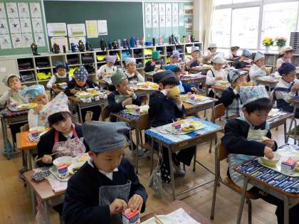 給食の準備がどんどん早くなっています。サッと素早く準備にとりかかる当番と、静かに順番を待つ当番以外の子供たち。みんなで力を合わせてがんばる姿はすごくすてきでした!さらに、苦手なものも一口でも多く食べようとがんばっています。どんどん成長している2年生の子供たちです。