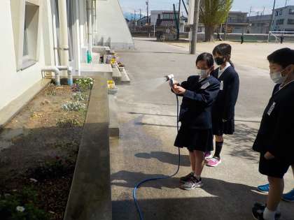 今日の桜っ子タイム、飼育栽培委員会では、ウサギの世話と花壇の水やりについて6年生から5年生に仕事の進め方について説明があり、実際にお世話をしてみました5年生のみんなは、しっかりと話を聞き、えさ換えや小屋の掃除、水やり等に取り組んでいました。