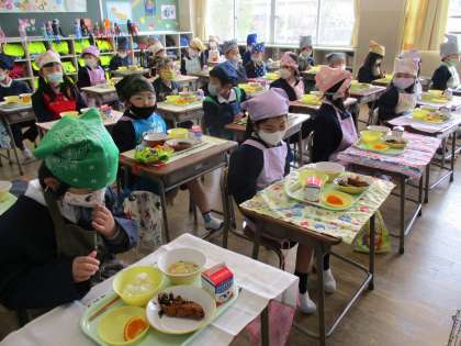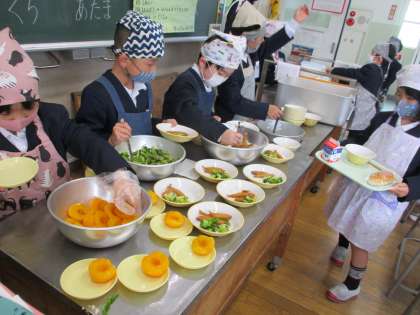 3時間目になると、「あ〜おなかすいたなあ」という声が聞かれます。1年生はみんな給食を毎日楽しみにしています。給食の時間になると、ささっとエプロンや三角巾を身に付け、静かに自分たちで配膳をしています。少しずつ手際がよくなってきました。