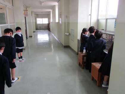学校では、様々な場面で手を洗うことを心がけています。ソーシャルディスタンスを保ちながら、体育の後や給食を食べる前、休み時間の終わりなど、みんなで声をかけ合って取り組んでいます。