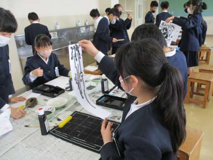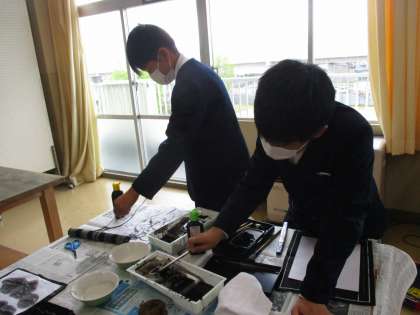 普段書写で使っている墨と筆を、今日は図工の作品で工夫して使いました。墨と水の割合を変えたり、束子やひも等、描く道具を組み合わせたりすることで様々な世界が生まれてきました。片付けもさすが6年生です!時間内に全員が協力して終わらせていました。