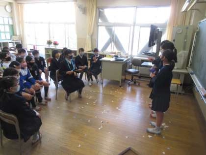 今日、お祝い係主催のお誕生日を祝う会がありました。短い時間に紙吹雪などの楽しい工夫がつめこまれていました。クラスのみんなにお祝いされて、誕生日の人はとてもうれしそうでした。
