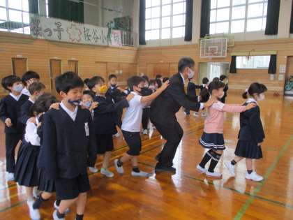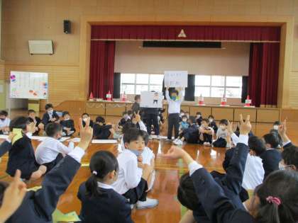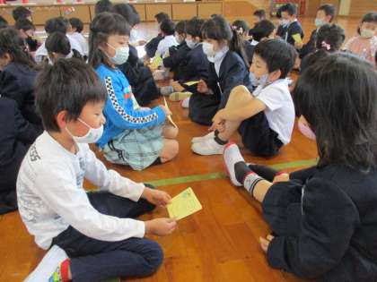 入学してから約1ヶ月経ち、小学校にも徐々に慣れてきた子供たち。今日は、同じ2階で過ごしている2年生さんが1年生のために集会を開いてくれました。これまで、廊下ですれ違う程度だった2年生から名刺をもらった1年生は、うれしそうに眺めていました。学校クイズで学校のことを教えてもらったり、じゃんけん列車を楽しんだりし、1組の子供たちは「楽しかった!」「うれしかった!」と大満足でした。これからも、学年を超えて仲良しの輪が広がっていくことを願っています。