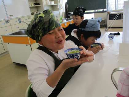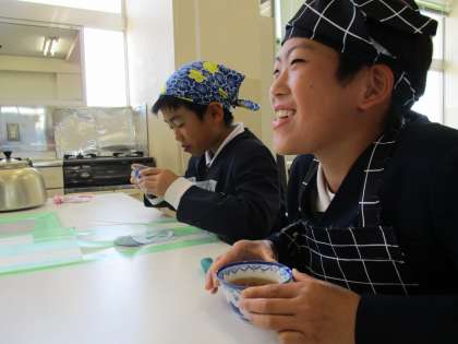 家庭科でお茶をいれました。 みんな、いい顔して飲んでいます。