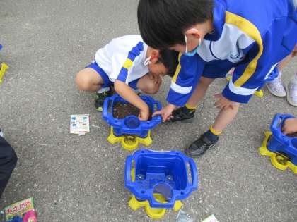 今日は3,4限めにあさがおのたねうえをしました。昨日の計画の時から楽しみにしていたので、朝からあさがおの話でいっぱいの様子でした。天気は曇りでしたが「楽しい!」といいながら張り切ってしました。これからどんな成長が見られるか楽しみですね。