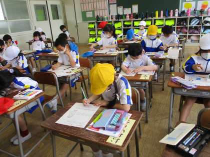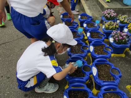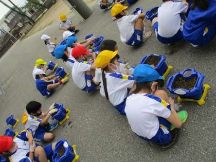 あさがおを育てる鉢を見て、うれしそうな子供たち。土を入れて肥料を入れて、指で穴をあけて4つの種をまきました。「大きくなってね」「きれいな花が咲いてほしいな」とあさがおに優しく語りかける子もいました。「水もあげんなん!」と、せっせとお世話をしていました。最後には、教室へ戻って、種をまいたときの絵を集中して描いていました。