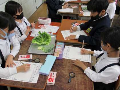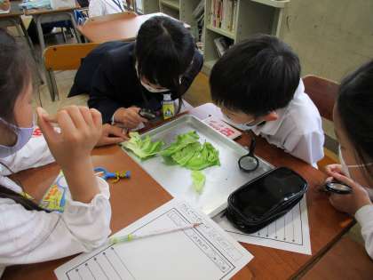 理科の観察でモンシロチョウのよう虫の観察をしました。葉っぱを食べていたり動いていたりしている様子に歓声をあげていました。これから成虫になるまで観察をしていきます。育っていくのが楽しみですね。
