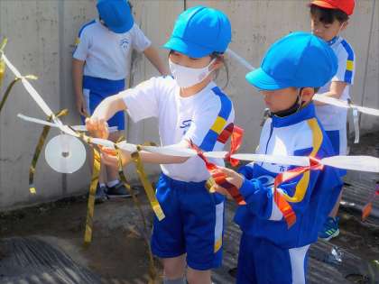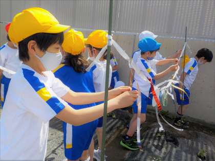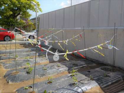 子供たちが植えた野菜の苗が、カラスにいたずらをされていました。そこで、子供たちと「カラスから野菜を守るためにはどうしたらよいだろう」といろいろな方法を考えました。「カラスがこないようにするためには、キラキラのものをつけたらいいよ!」というある子どもからの提案で、CDやテープを使って、カラスよけをつくりました。