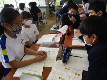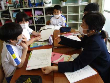 「聞いて、考えを深めよう」の学習では、自分の立場をはっきりさせながら意見を述べ、友達の意見との違いや共感できる点を探しながら聞いて、話し合いを進めました。
