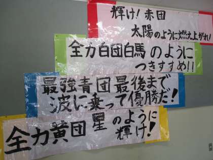 運動会のスローガン、各団のスローガンの幕が完成しました。土曜日の本番に向けてさらに盛り上がっています!