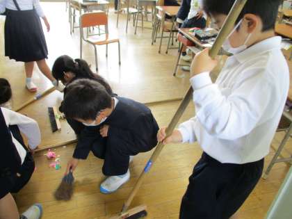 折り紙を切った破片がたくさん落ちている教室を見て、自分たちでてきぱきと後始末にかかった1年生。進んで働く1年生、立派です。