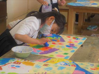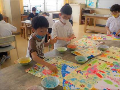 ふしぎなたまごの作品の仕上げをしました。ガーゼと脱脂綿でつくったスタンプで、ぺたぺた、ポンポンしました。すてきな作品に仕上がりました。