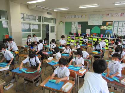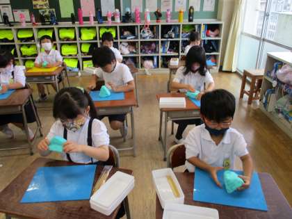 図工の時間にねんどをしました。小学校にはいってはじめてのねんどで、いろんな形を作ったり、のばしたり、お友達の作品をみながらたのしい図工の時間でした。「休み時間もやりたいなあ」というくらいねんどを楽しんでいる様子が見られました。これからいろんなものを作っていきましょうね。