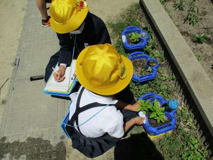 ホウセンカの観察を行いました。「葉の数がたくさんある!」「さわり心地が葉によって違うよ!」「どんどん大きくなってきた!」と発見がたくさんの3年生です。じっくりと観察することが出来ました。