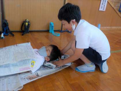 図画工作科では、新聞紙をちぎったり、まるめたりして、しんぶんしとなかよくなりました。新聞紙のふとんやまくら、洋服、お風呂、剣、旗などいろいろなものを表現していました。