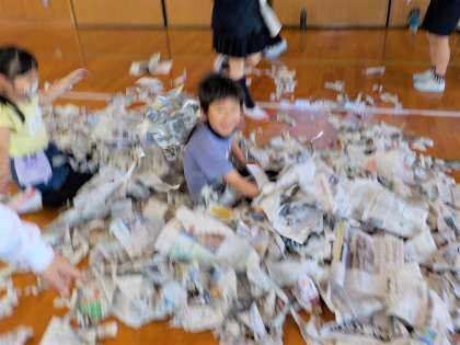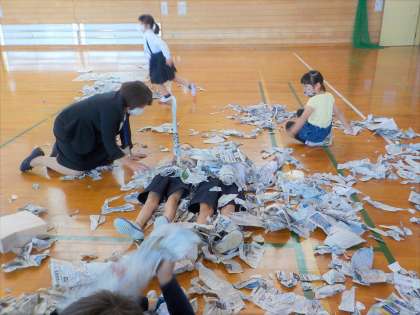 体育館いっぱいに広がった新聞紙でしたが、帰る時には、1つも新聞紙が残っていませんでした!片付け上手の2年生です。