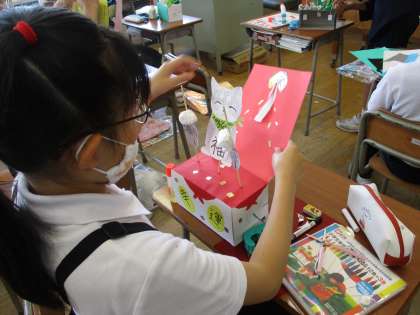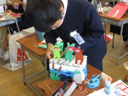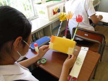 図工では「くるくるクランク」の作品づくりをしています。クランクの動く仕組みをうまく使って、イメージを膨らませていました。様々な材料を工夫して組み合わせて満足のいく作品に近づけています。