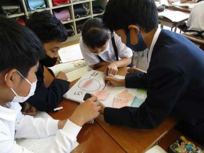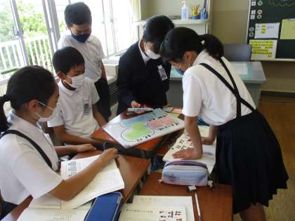 国語では、説明文に書かれた筆者の主張とその事例の文章構成について班の友達と考えました。段落ごとの内容と大事な言葉を抜き出し、整理しながら、ホワイトボードにまとめていました。