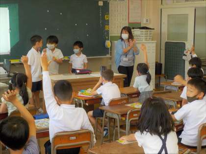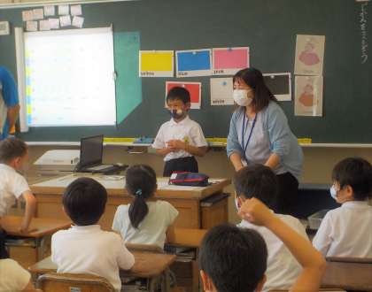 5時間目に、外国語の学習をしました。色を英語で言ったり、言われた色を指さしたりと、いろいろな方法で英語に親しんでいました。下校のコースを呼ぶときには、「レッド〜!」「イエロー並んで−!」と、覚えた英語を使って、嬉しそうな表情でいっぱいでした。
