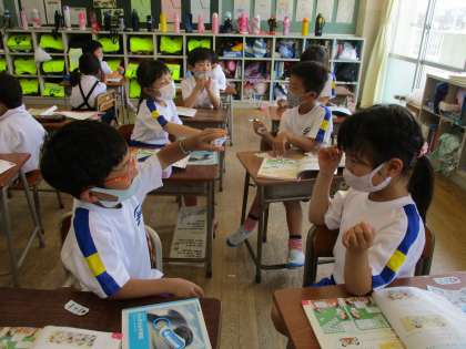 計算カードを使った足し算の練習が始まりました。友達と問題を出し合いながら、楽しく取り組んでいます。