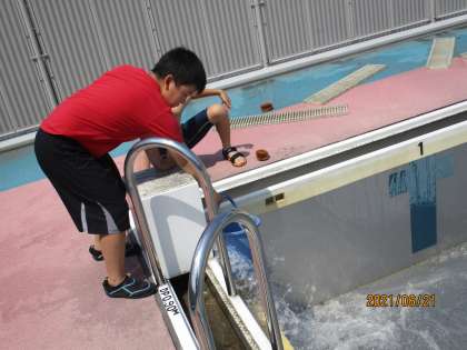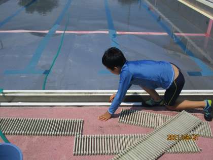 まぶしい太陽に照らされながら、5年生でプール清掃を行いました。