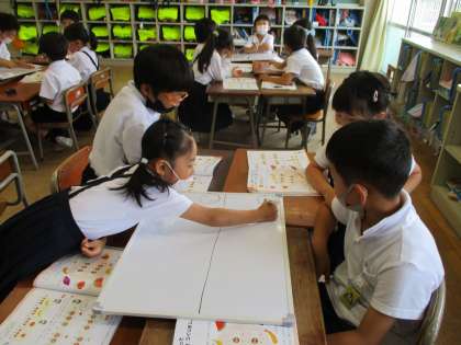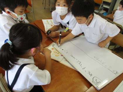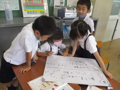 音楽では、「たんたんたんうん」「たたたたたんうん」のリズムになる言葉を見つけて、手をたたいています。今日は、ホワイトボードに3文字と5文字の食べ物の名前をたくさん集めました。みんなでペンを順番に回して、全員が言葉を書けるように協力していた子供たちです。