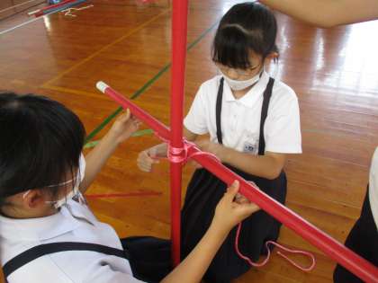 活動プログラムにある「森の遊び場づくり」で行う、縄の縛り方も教えていただき練習しました。班のみんなと声を掛け合って全員がマスターできるように協力していました。どんな遊び場を作ろうか、いろいろイメージも膨らんでいるようでした。晴れるといいね!