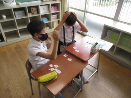 まず、カルタゲームで曜日の英単語に慣れ親しみました。そしてその後、“What day is it today?”“How are you?”と、それぞれの曜日の気分を尋ね合いました。