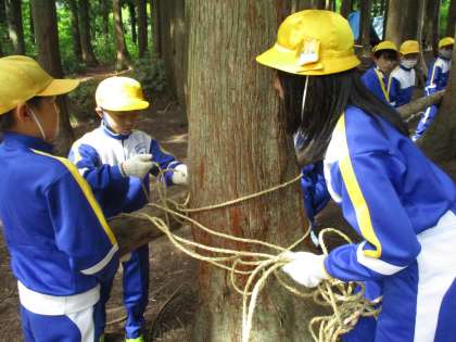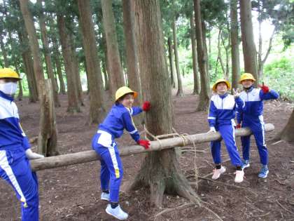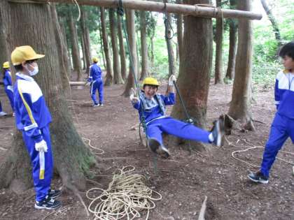 午後からの活動は、子供たちが楽しみにしていた森の遊び場づくりです。各団自分たちの理想の遊び場を作るために、協力して丸太を持ったり縄を縛ったりしていました。楽しい遊び場が完成し、みんなとても満足そうです!