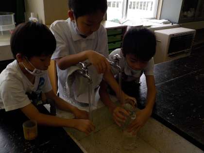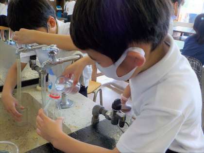 算数科では、水のかさをあらわす学習をしています。今日は、ペットボトルや紙コップが、1dLいくつ分なのかを実際にはかってみました。「思ったより少ない!」「もっと入ると思っていた!」などと、自分の予想と比べながらはかっていました。