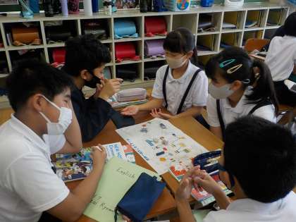 今日の外国語の時間は、すごろくでいろいろな国に行き、そこでの会話を楽しむという学習活動に取り組みました。さいころを振って、出た目の数だけ進み、到着した国で、あいさつをしたり、会話をしたりしました。みんな、楽しそうに取り組んでいました。