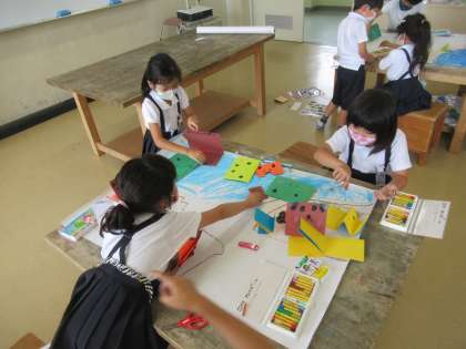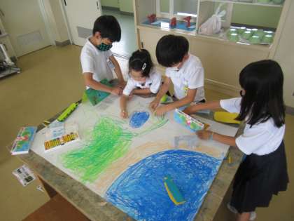 「まだまだしたい!」という声がたくさん聞こえ、自分たちの作品に夢中になっている様子でした。友達同士で、一緒に道路を作ったり、海に浮かべる魚を作ったりと、一人ではできないことも協力しながらできましたね。