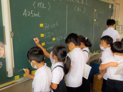 家で見つけてきたmL、dL、Lをみんなで紹介し合いました。調べていく中で、「dLは身の回りでは全然使われていなかったよ」「ペットボトルの飲み物はmLばっかりだね」などと、いろいろなことに気づいていました。
